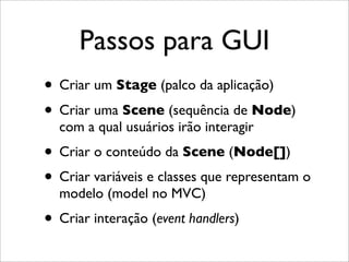 O documento apresenta os principais conceitos e elementos para construção de interfaces gráficas em JavaFX, incluindo como criar janelas, adicionar botões, caixas de texto e imagens.