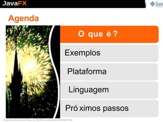 Este documento apresenta uma introdução ao JavaFX, descrevendo o que é JavaFX, seus principais componentes como a linguagem JavaFX Script, a plataforma multiplataforma e exemplos de aplicações. O documento também fornece próximos passos para desenvolvedores começarem a usar JavaFX, baixando as ferramentas e exemplos e participando de fóruns e tutoriais.