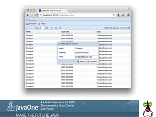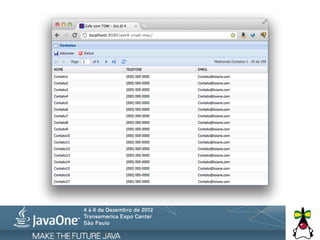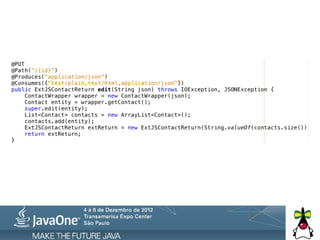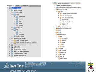O documento discute a integração do framework Ext JS com Java EE, incluindo prós e contras dos diferentes frameworks e cuidados necessários. Ele também apresenta exemplos de arquitetura para projetos que utilizam Ext JS e Java, além de opções para comunicação entre as tecnologias.