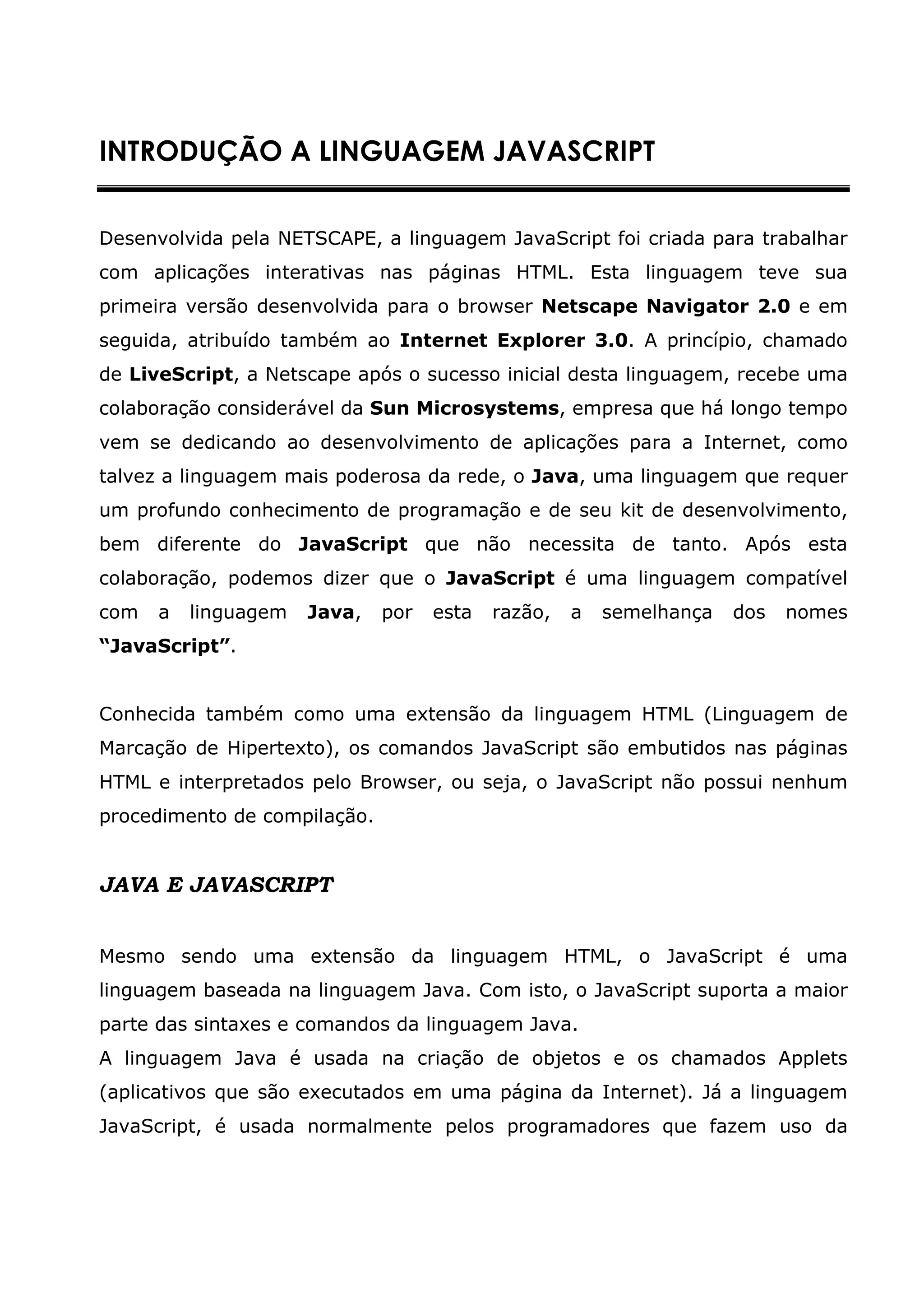 O documento apresenta uma introdução à linguagem JavaScript, explicando sua criação e evolução, destacando sua relação com a linguagem Java e a compatibilidade com HTML. O texto detalha conceitos fundamentais como manipulação de objetos, orientação a objetos, eventos e variáveis, além de descrever a hierarquia de objetos e o uso de métodos e eventos em scripts. Por fim, aborda a importância da compatibilidade entre navegadores e as versões do JavaScript conforme suas implementações em navegadores populares.