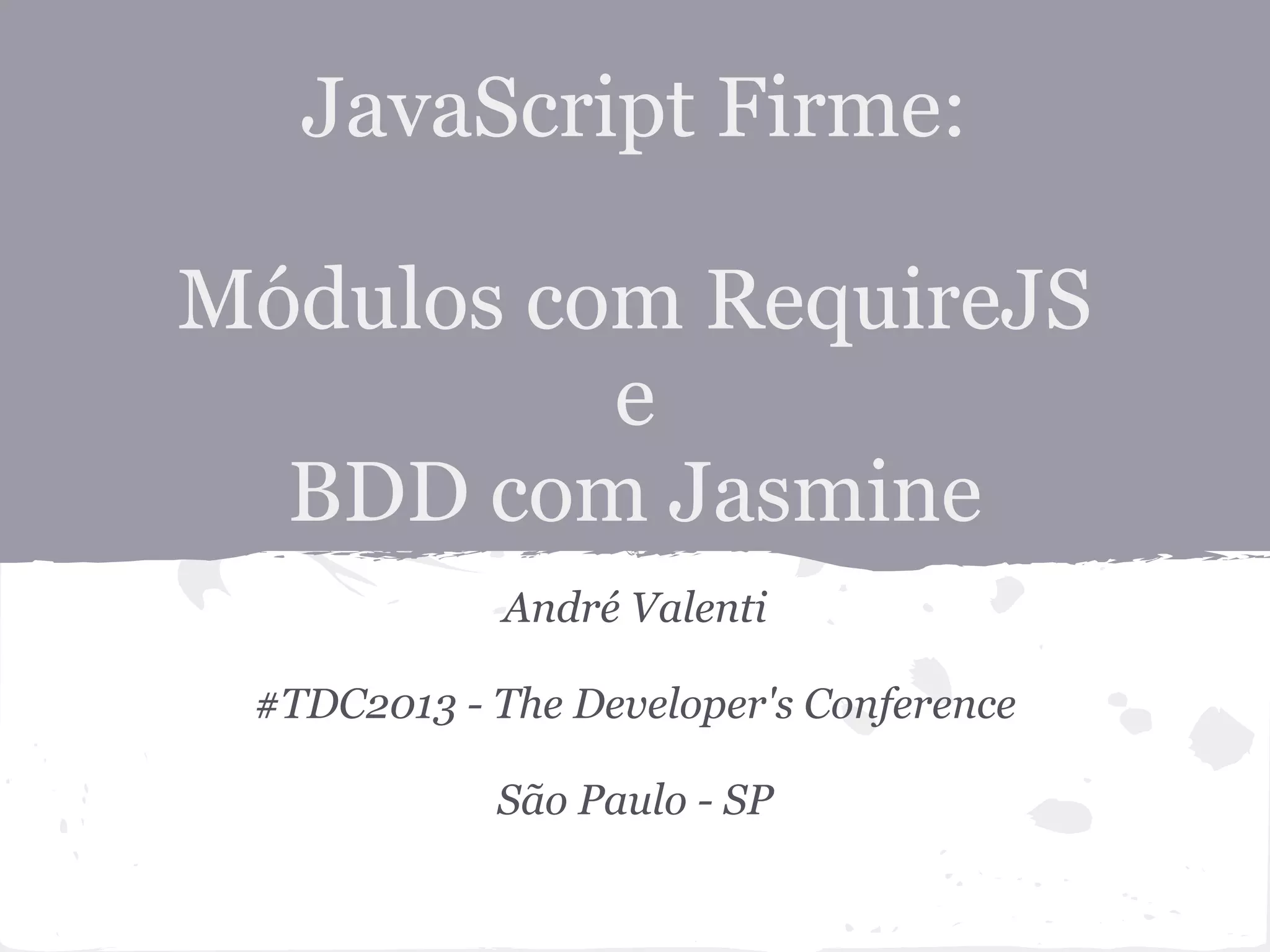 Este documento discute estruturação de projetos JavaScript usando módulos com RequireJS e testes com Jasmine. Primeiro, explica os benefícios de estruturar o código em módulos para reduzir acoplamento e dependências implícitas. Em seguida, apresenta o framework Jasmine para escrever testes de comportamento (BDD) e guiar o design antes da implementação. Por fim, resume dizendo que estrutura e testes resultam em mais flexibilidade, sossego e qualidade no desenvolvimento.