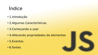 O documento descreve JavaScript, incluindo suas características como linguagem baseada em C e orientada a objetos, e como integrá-la com HTML para interagir com o usuário sem precisar do servidor. Também explica como acessar e alterar propriedades de elementos e usar eventos.