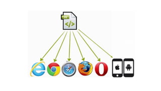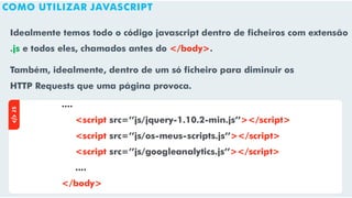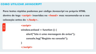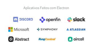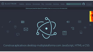 O documento apresenta as principais tecnologias e evoluções da linguagem JavaScript, incluindo introdução ao jQuery, TypeScript, NodeJS e Angular. Também discute o uso do JavaScript fora do navegador, no desenvolvimento de aplicativos desktop com Electron e mobile com React Native.
