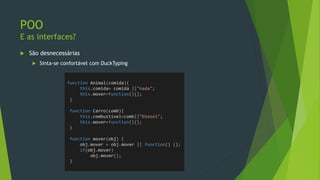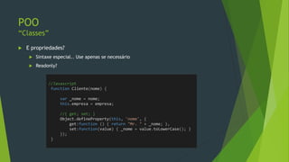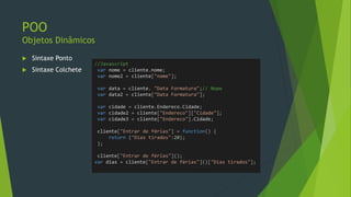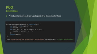 Este documento discute conceitos de programação orientada a objetos em Javascript para desenvolvedores acostumados com C#. Ele explica como Javascript lida com objetos dinâmicos, "classes", herança e outros conceitos usando o objeto prototype. O documento também mostra como simular classes abstratas e métodos de extensão usando prototype.