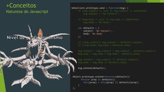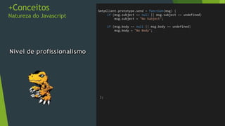 O documento discute conceitos de Javascript para desenvolvedores C#, comparando sintaxes e abordagens entre as linguagens. Apresenta tópicos como 'use strict', iterações, reflection, natureza de Javascript, arquitetando código e referenciando bibliotecas. Realiza exercícios sobre validações, reflection e arquitetura de código para solidificar os conceitos discutidos.