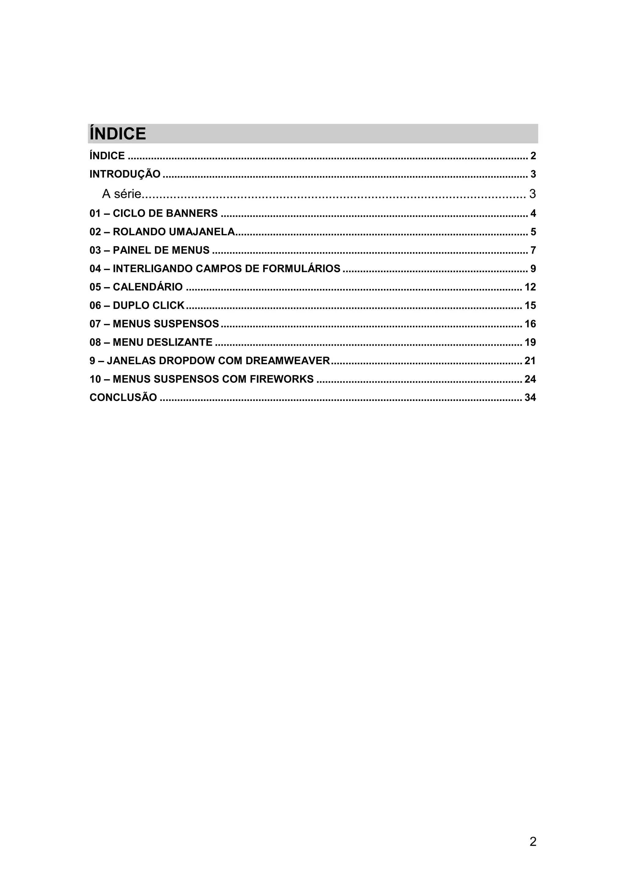 O documento fornece exemplos de códigos JavaScript para criar diversos elementos interativos em páginas web, como ciclo de banners, janelas rolantes, painéis de menus, interligação de campos de formulários, calendário de eventos, duplo clique, menus suspensos e outros. O foco é ensinar técnicas básicas e avançadas de JavaScript por meio de exemplos práticos passo a passo.