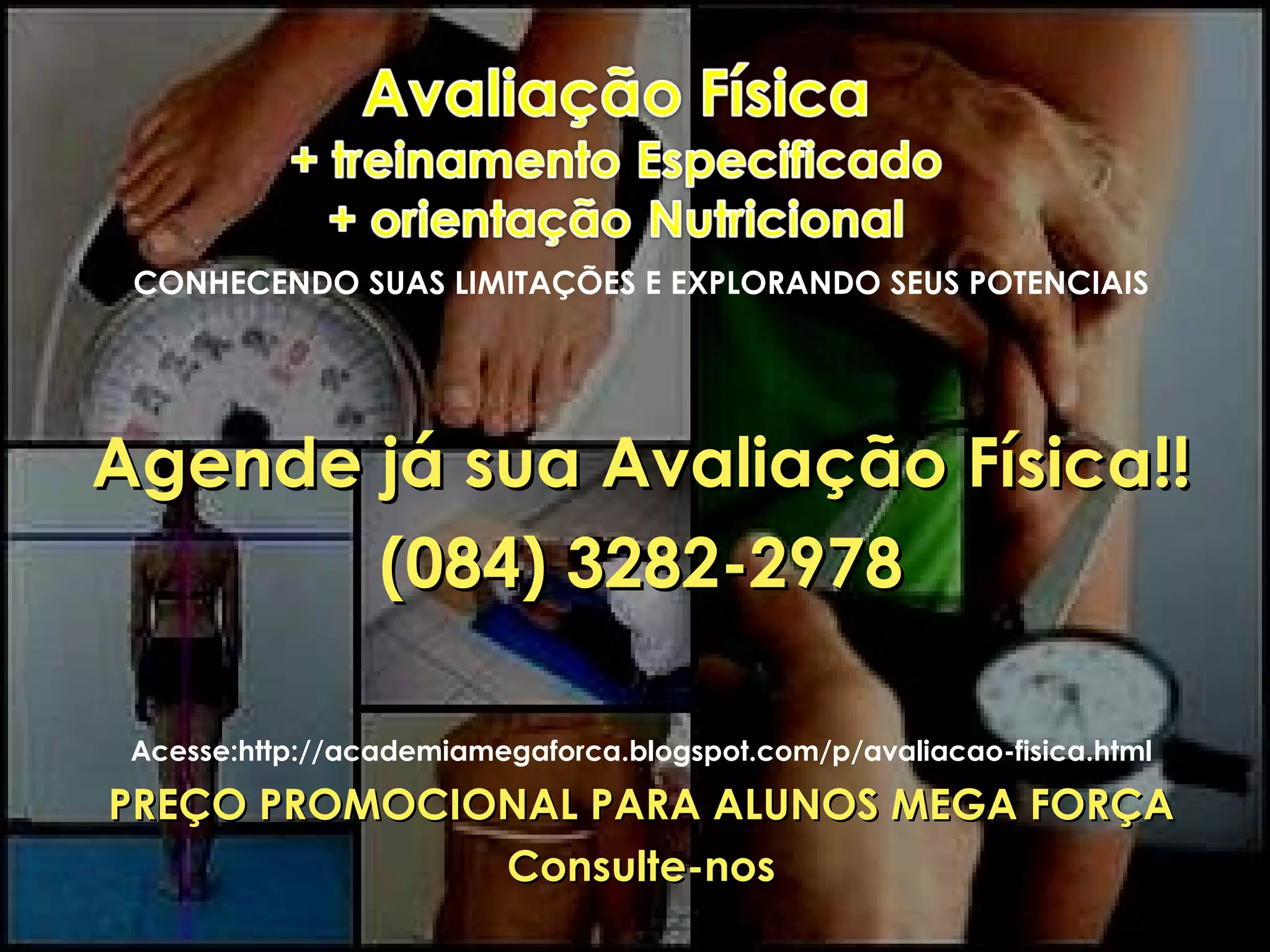 Este documento promove os serviços de uma academia chamada Mega Força, oferecendo avaliação física, vários tipos de aulas de ginástica e musculação, como pilates e dança, a preços promocionais para alunos. Também apresenta as credenciais do personal trainer João Batista, com formação em educação física e especialização em nutrição, biomecânica, fisiologia e avaliação física.