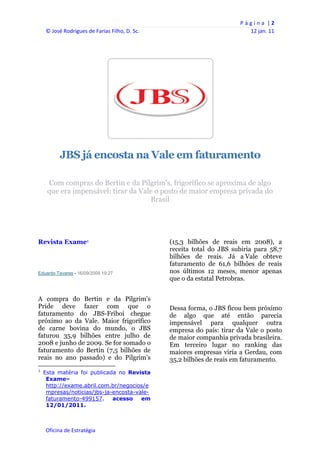 1) O documento descreve a trajetória de crescimento da empresa brasileira JBS, que se tornou a maior processadora de carnes do mundo após uma série de aquisições no Brasil e no exterior.