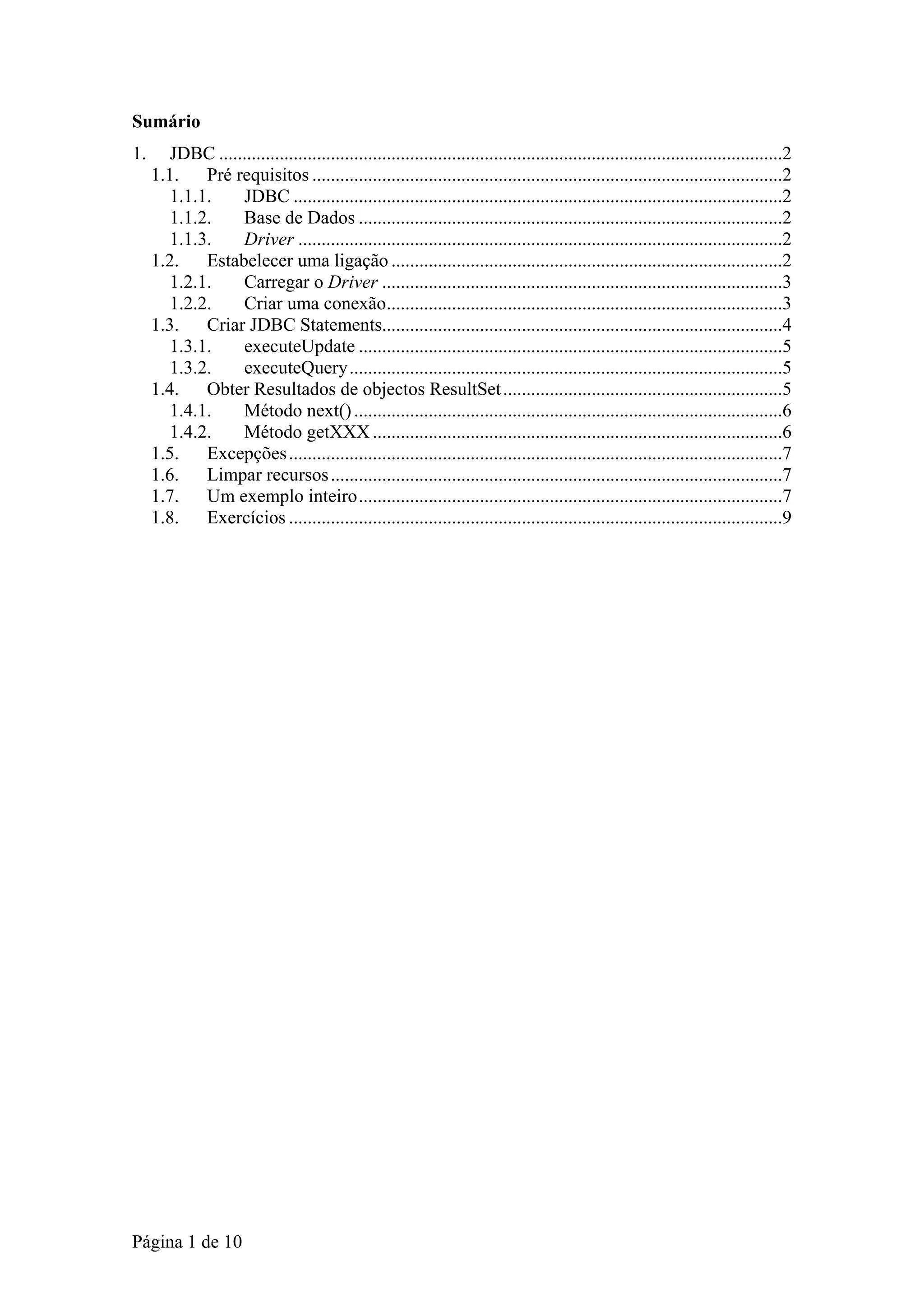 O documento descreve os principais conceitos e etapas para se conectar e realizar operações em uma base de dados usando JDBC no Java, incluindo carregar o driver apropriado, estabelecer uma conexão, criar statements, executar queries e updates, obter e tratar resultados.