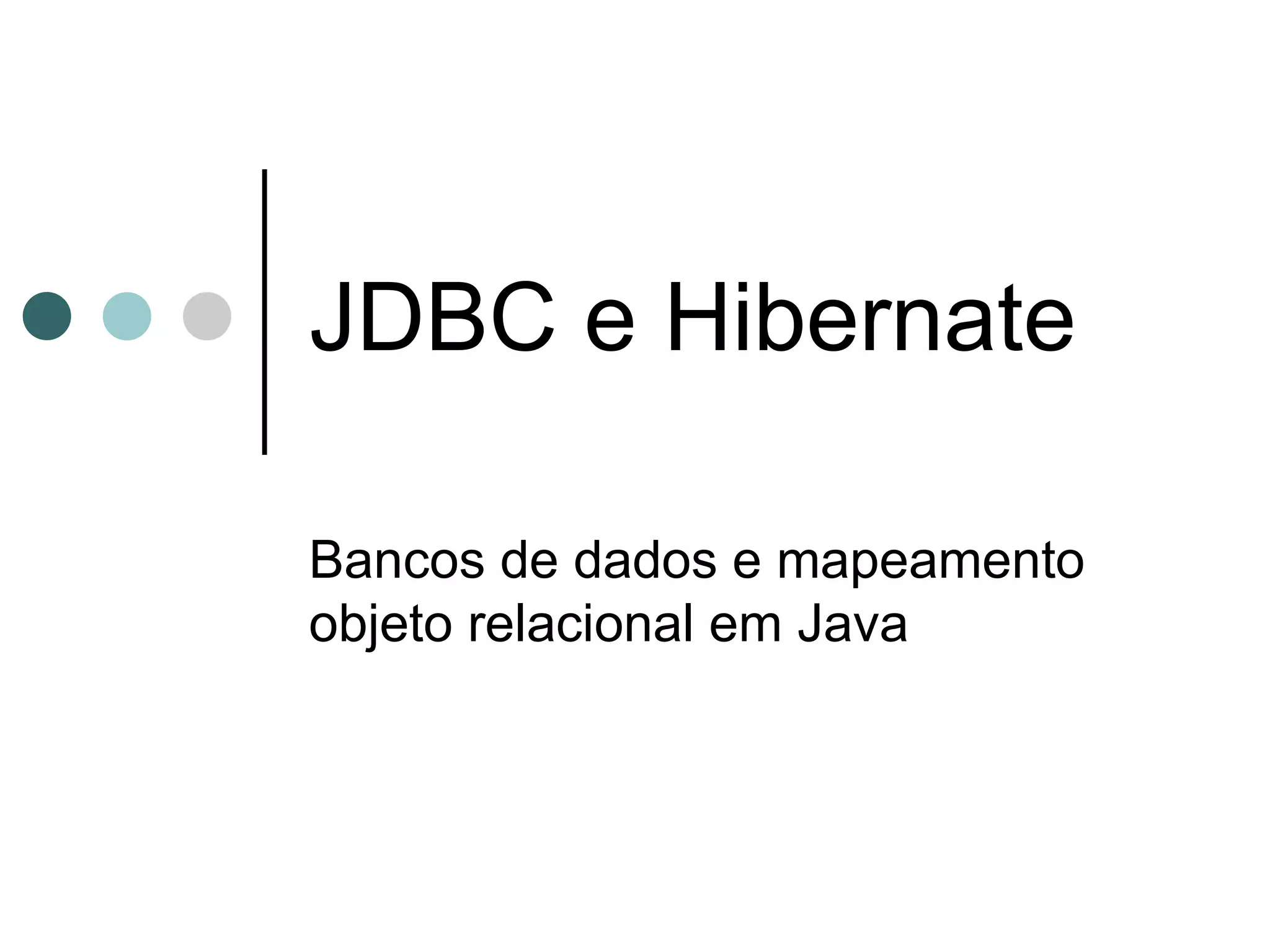 O documento explica os principais conceitos e ferramentas para acesso a bancos de dados relacionais usando JDBC no Java, incluindo interfaces como Connection e Statement, PreparedStatement, CallableStatement, transações, isolamento de transações e tipos de ResultSets.