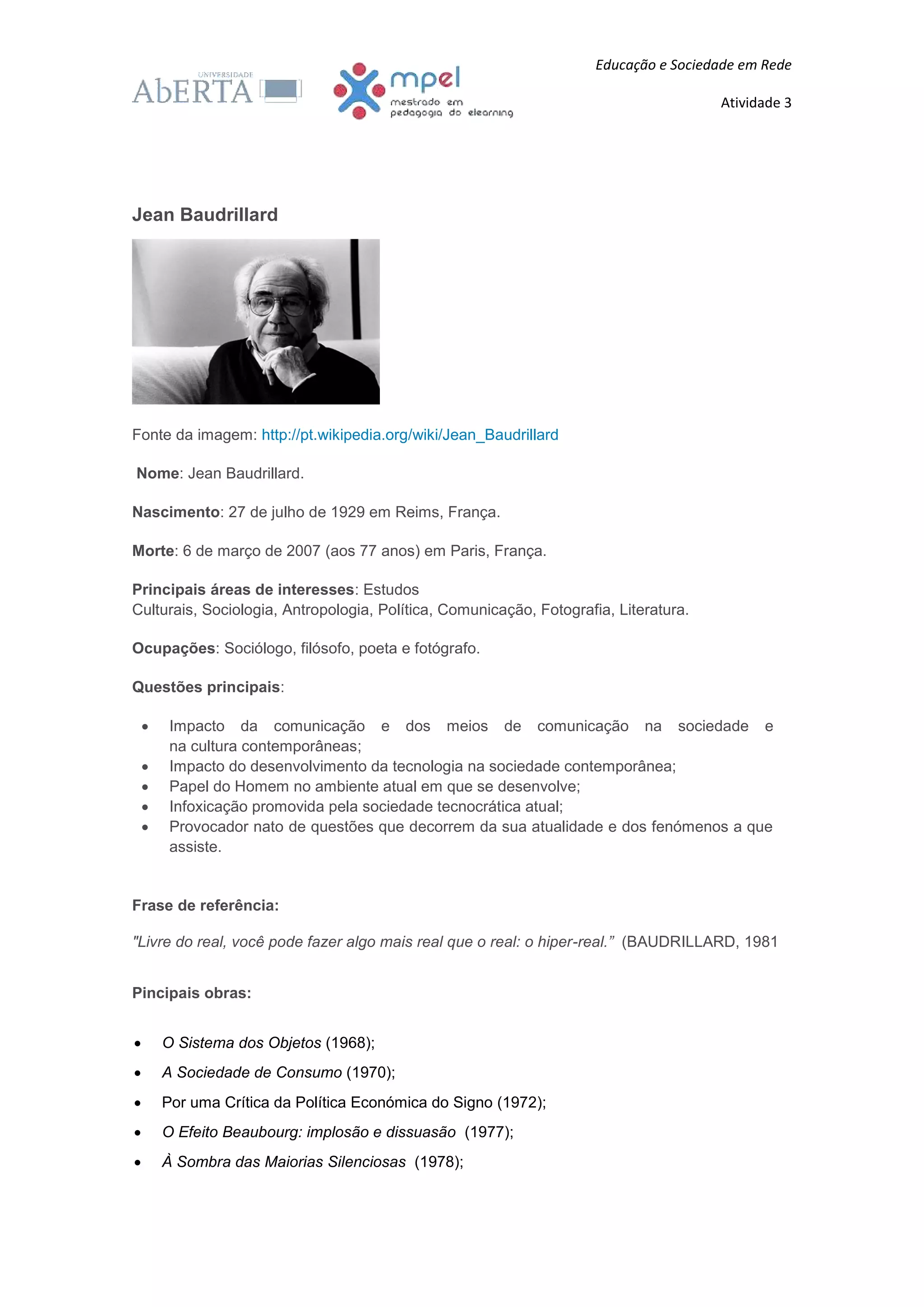 Jean Baudrillard era um sociólogo e filósofo francês que analisou como a comunicação e tecnologia modernas influenciam a sociedade. Ele argumentou que vivemos em uma hiper-realidade criada pelos meios de comunicação, onde sinais e simulações se tornaram mais reais do que a realidade. Baudrillard também discutiu como a informação excessiva ("infoxicação") afeta as pessoas e como a simulação substitui a representação do mundo real.