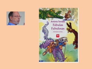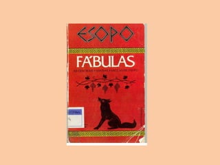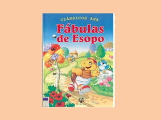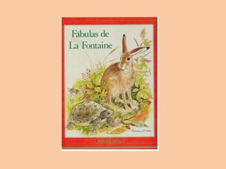 O documento descreve o que é uma fábula, seus principais autores como Ésopo, Fedro e Jean de La Fontaine, e fornece exemplos e detalhes biográficos sobre cada um. Uma fábula é uma pequena narrativa que usa animais ou criaturas para ilustrar lições morais sobre traços humanos. Ésopo é considerado o "pai da fábula" e escreveu histórias famosas como "A Cigarra e a Formiga". Fedro e La Fontaine também escreveram fábulas, se inspirando no