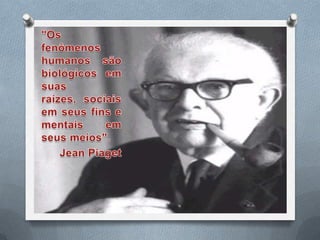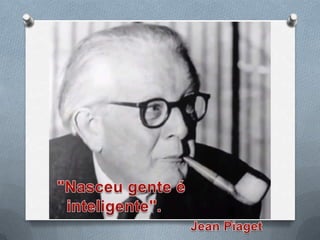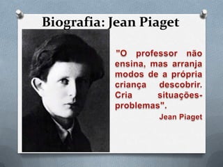 O documento descreve a vida e obra do psicólogo Jean Piaget, fundador da epistemologia genética. Aborda seus estudos iniciais em biologia, seu trabalho pioneiro investigando o pensamento infantil em Paris, e seu modelo dos estágios do desenvolvimento cognitivo da criança. Também discute as contribuições e implicações de sua teoria psicogenética para a educação.