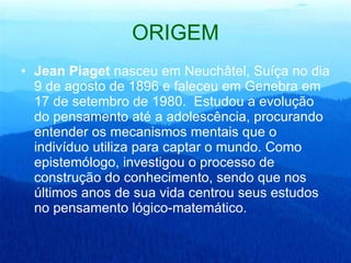 Jean Piaget nasceu na Suíça em 1896 e estudou o desenvolvimento do pensamento infantil. Ele observou que as crianças pensam de forma diferente dos adultos, passando por estágios de desenvolvimento sensoriomotor, pré-operatório, concreto e formal. Sua teoria construtivista enfatiza que as crianças constroem ativamente o conhecimento por meio da assimilação e acomodação de esquemas mentais ao interagirem com o meio ambiente.