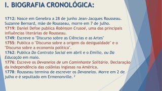 Jean-Jacques Rousseau, nascido em 1712, foi um filósofo influente do Iluminismo que explorou temas como a educação e a desigualdade social em obras como 'O Contrato Social' e 'Emílio'. Ele defendia a bondade natural do homem e uma abordagem educacional centrada na criança, criticando a influência corruptora da civilização e promovendo a aprendizagem por meio da experiência e do instinto. Apesar de suas contribuições significativas, Rousseau foi criticado por sua visão limitada sobre educação pública e o papel das mulheres na sociedade.