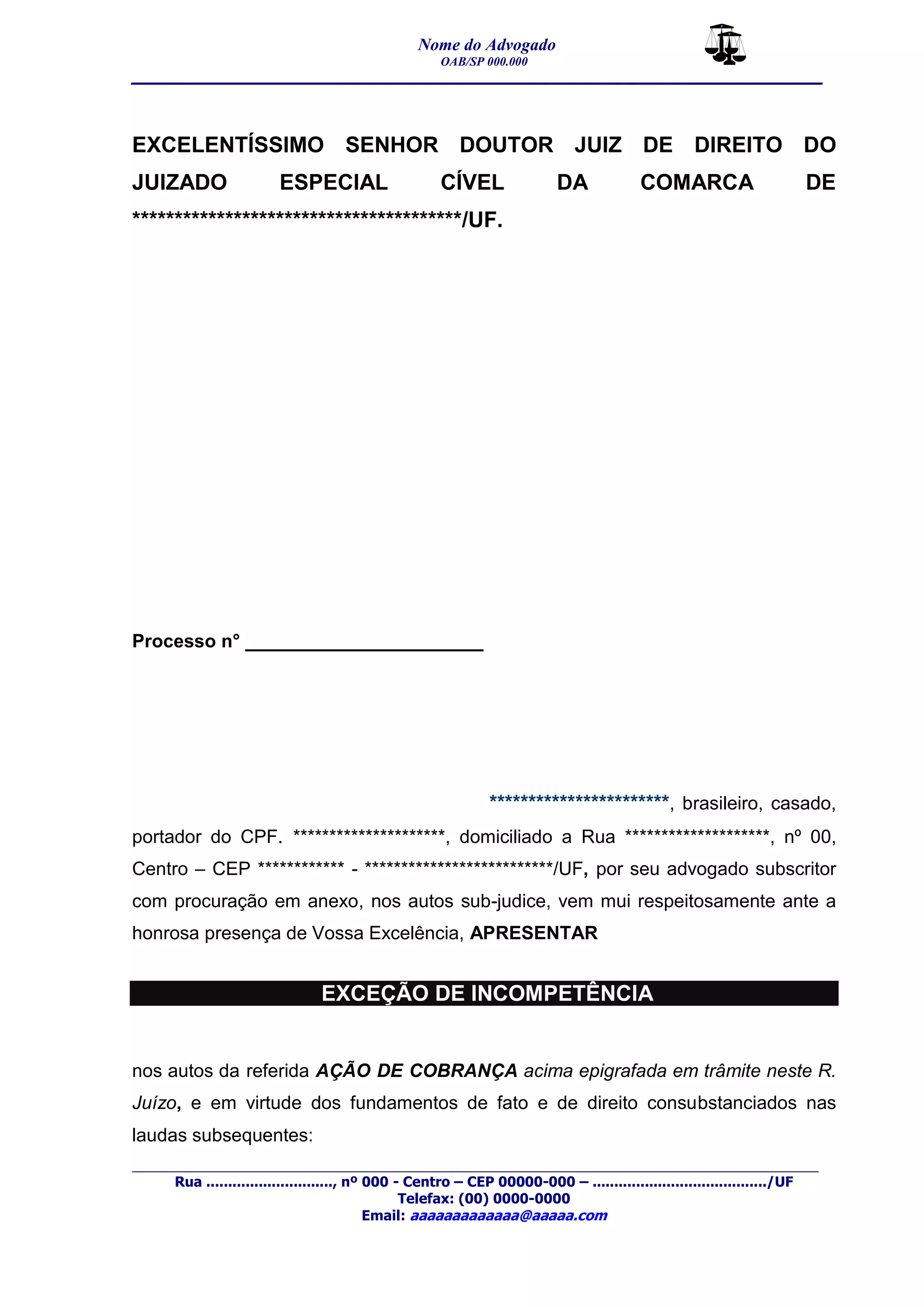 O documento é uma exceção de incompetência apresentada por um advogado em uma ação de cobrança movida no Juizado Especial Cível. O advogado argumenta que o autor da ação não tem legitimidade para propor a ação, pois os cheques cedidos eram de uma pessoa jurídica, o que não é permitido no Juizado Especial. Sendo assim, pede a declaração de extinção do processo sem julgamento do mérito.
