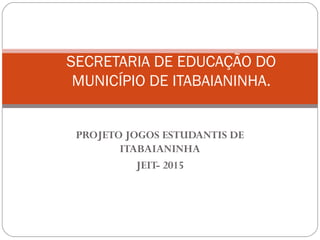 Este documento descreve o projeto dos Jogos Estudantis de Itabaianinha de 2015, organizado pela Secretaria de Educação do município. O projeto tem como objetivos promover o esporte estudantil, o lazer e o desenvolvimento dos estudantes, além de fortalecer os laços comunitários. Será realizado entre 31 de agosto e 4 de setembro em diversos locais da cidade e contará com a participação de cerca de 1500 alunos de 15 escolas em modalidades individuais, coletivas e pré-desportivas.