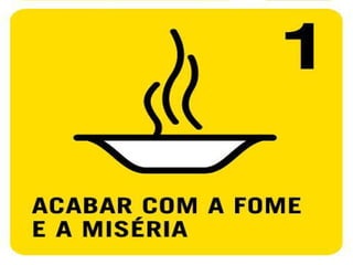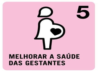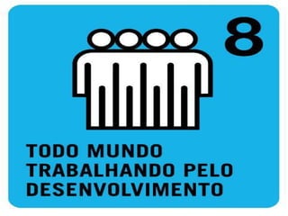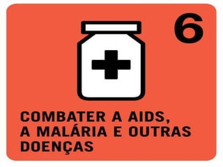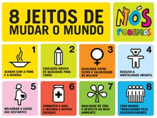 O documento descreve oito metas para melhorar o mundo até 2030: 1) acabar com a fome e a miséria; 2) educação básica de qualidade para todos; 3) igualdade entre os sexos e valorização da mulher; 4) reduzir a mortalidade infantil; 5) melhorar a saúde das gestantes; 6) combater a AIDS, malária e outras doenças; 7) qualidade de vida e respeito ao meio ambiente; 8) todo mundo trabalhando pelo desenvolvimento. Ele lista ações que as pessoas podem tomar para ajudar a alcançar ess
