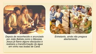 O documento descreve várias passagens dos evangelhos em que Jesus pregava e realizava milagres nas sinagogas da Galileia e de Cafarnaum, ensinando sobre o Reino dos Céus e curando os enfermos. Jesus também enfrentou incredulidade em sua cidade natal de Nazaré, onde não pôde fazer milagres.