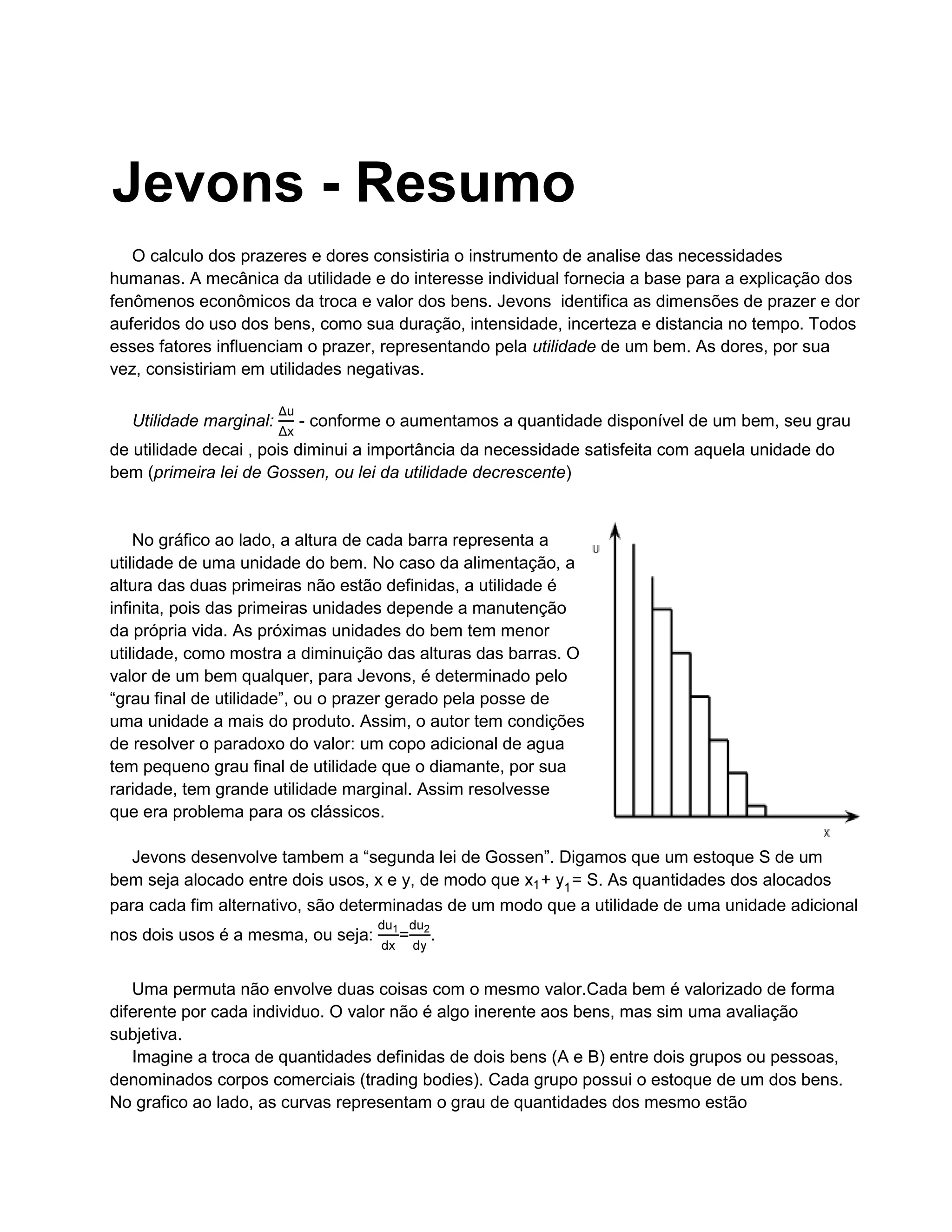 O documento discute a teoria da utilidade marginal de Jevons, na qual a utilidade de bens vai diminuindo conforme sua quantidade aumenta. Ele também apresenta a lei do valor de Jevons, onde o valor de um bem é determinado pelo prazer gerado por sua última unidade, e explica como a troca entre dois grupos é mutuamente benéfica quando iguala a utilidade marginal dos bens trocados.