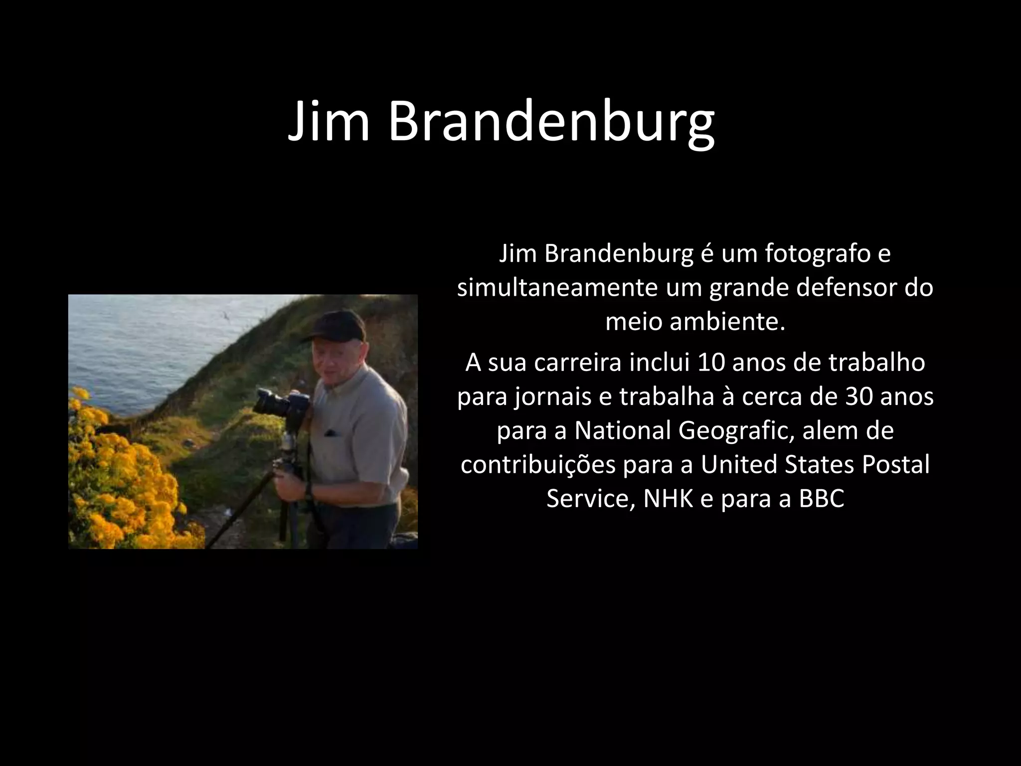 Jim Brandenburg é um fotógrafo e ambientalista americano que trabalhou durante 30 anos para a National Geographic, documentando locais em todo o mundo. Ele limitou-se a tirar uma foto por dia entre o outono e o inverno, resultando em algumas de suas fotos mais aclamadas, posteriormente publicadas em um livro. Sua carreira inclui contribuições para várias publicações e agências governamentais.