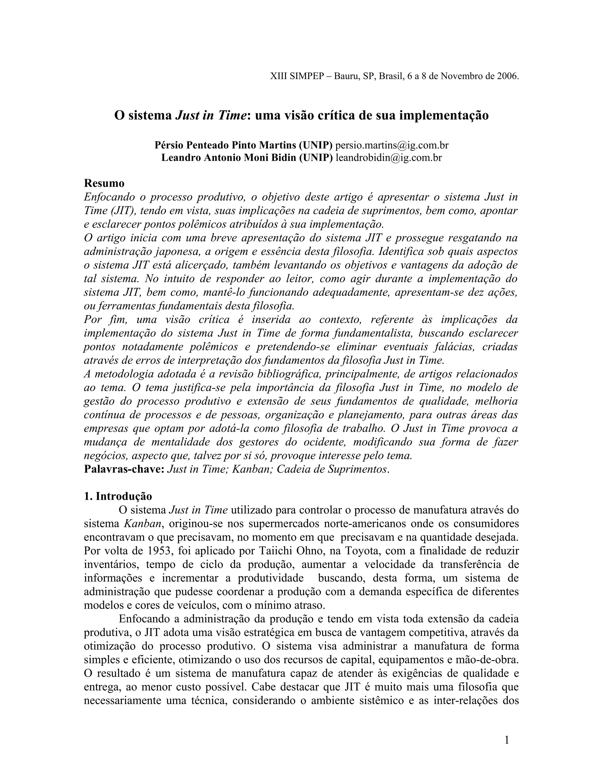 O documento discute o sistema de produção Just in Time (JIT), apresentando suas origens no Japão, princípios e ferramentas. O artigo explica que o JIT visa integrar e otimizar a produção para atender às demandas dos clientes com qualidade, prazo e custo, por meio da melhoria contínua e envolvimento dos fornecedores. Uma visão crítica sobre a implementação do JIT também é apresentada.