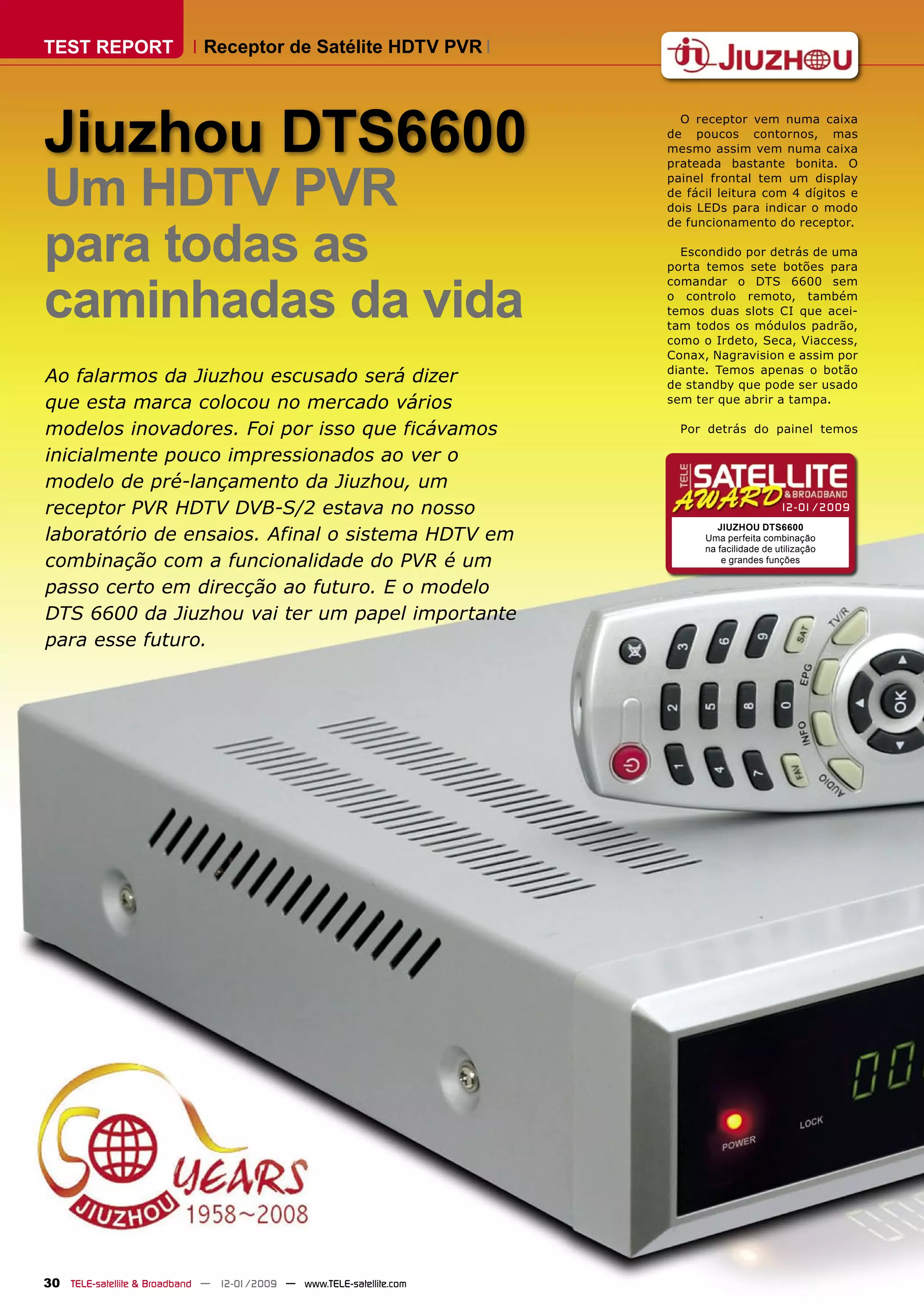 1) O documento descreve um receptor de satélite HDTV PVR da marca Jiuzhou modelo DTS6600, destacando suas especificações técnicas e funcionalidades.