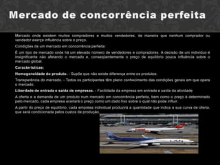 O documento define mercado como o local onde agentes econômicos trocam bens por dinheiro. Originalmente, mercados eram locais físicos onde compradores e vendedores se encontravam, mas hoje também podem ocorrer online. Existem diferentes tipos de mercado, como concorrência perfeita, oligopólio e monopólio.