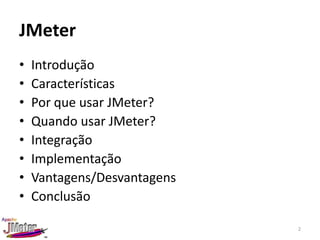 Este documento resume as principais características e funcionalidades do JMeter, uma ferramenta open source para teste de carga e desempenho de aplicações web. O JMeter simula múltiplos usuários acessando um sistema ao mesmo tempo para testar sua capacidade e identificar gargalos. Ele permite testes de HTTP, FTP e outras tecnologias, gera estatísticas e gráficos, e é extensível via plugins para diferentes necessidades.