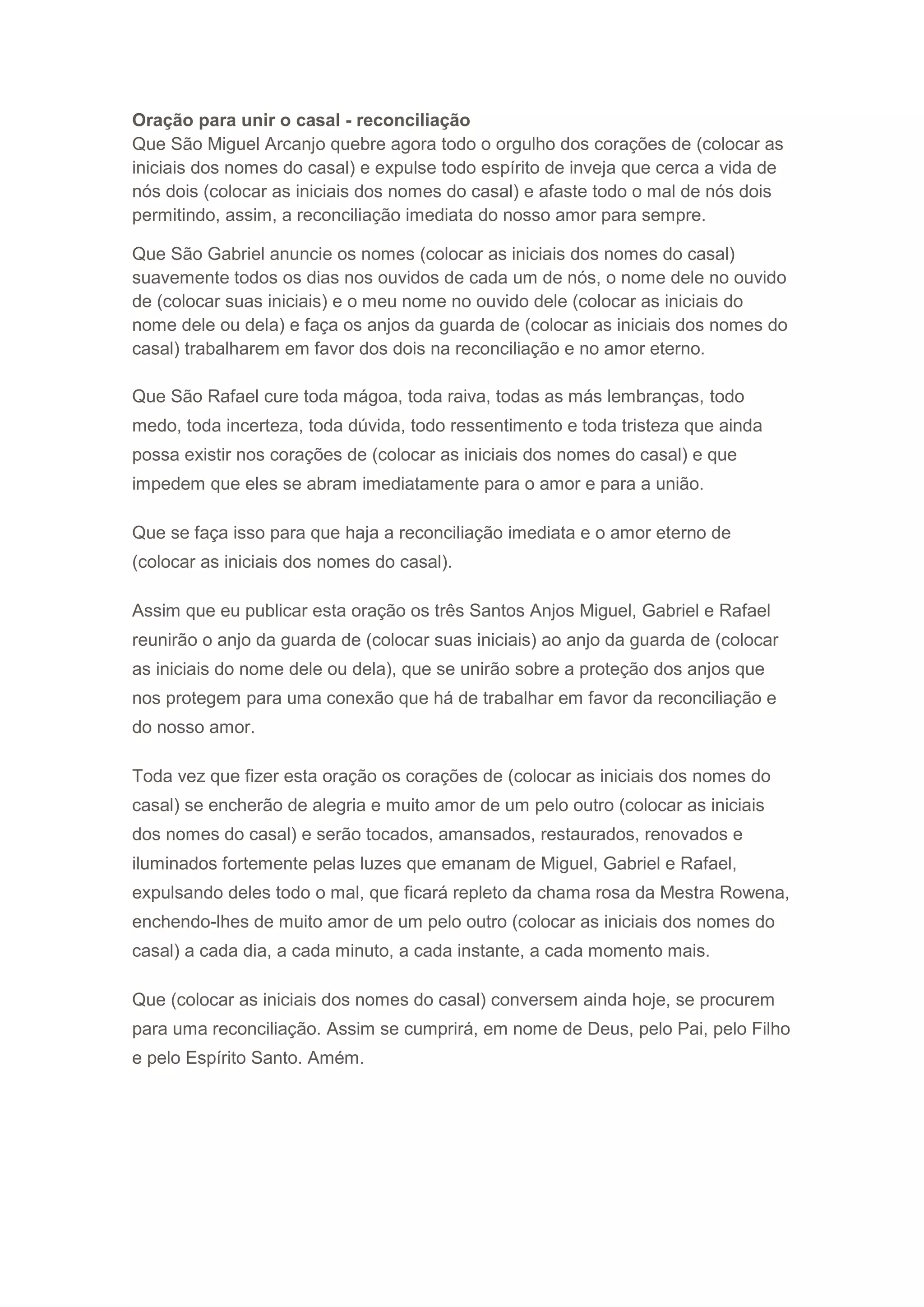 Este documento é uma oração para reconciliar um casal que está brigado. Pede aos anjos Miguel, Gabriel e Rafael que curem mágoas, raivas e outras emoções negativas que impedem o amor entre o casal, e que iluminem seus corações com a chama do amor para que se reconciliem.