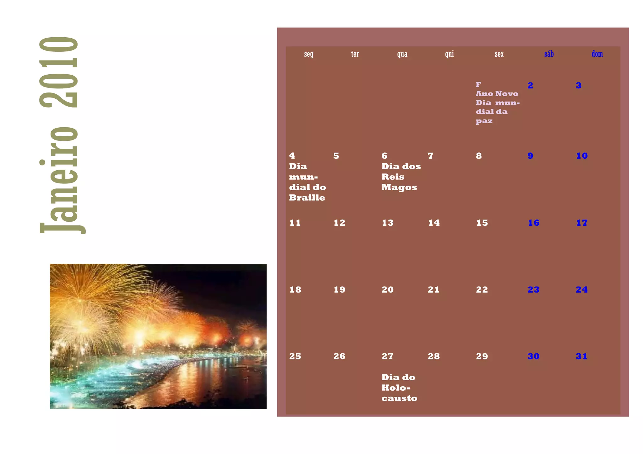 O documento apresenta um calendário de 2010 com datas comemorativas e feriados nacionais e internacionais para cada mês do ano. Algumas datas destacadas são: 1 de janeiro (Ano Novo), 6 de janeiro (Dia de Reis), 8 de março (Dia Internacional da Mulher), 21 de abril (Dia de Tiradentes), 1 de maio (Dia do Trabalhador), 7 de setembro (Dia da Independência do Brasil), 12 de outubro (Dia de Nossa Senhora Aparecida), 2 de nove