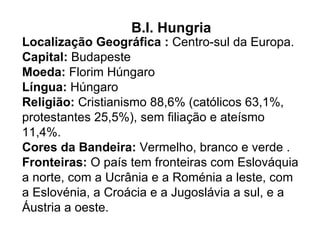 Este documento fornece informações gerais sobre a Hungria, incluindo sua localização, capital, moeda, língua, religião, fronteiras, presidente, primeiro-ministro, regime político, desportos nacionais, população, principais cidades, recursos hidrográficos, clima, adesão à União Europeia, compositores, artistas, personalidades, monumentos, costumes e gastronomia.