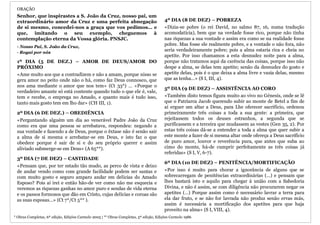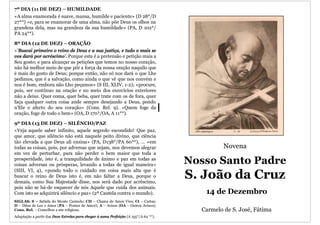 Este documento apresenta nove dias de uma novena dedicada a São João da Cruz, com temas como humildade, oração, silêncio, pobreza, assistência ao coro, penitência e amor a Deus e ao próximo. Cada dia traz citações do santo sobre o tema, destacando a importância da oração, da renúncia dos prazeres mundanos e do seguimento dos ensinamentos de Cristo.