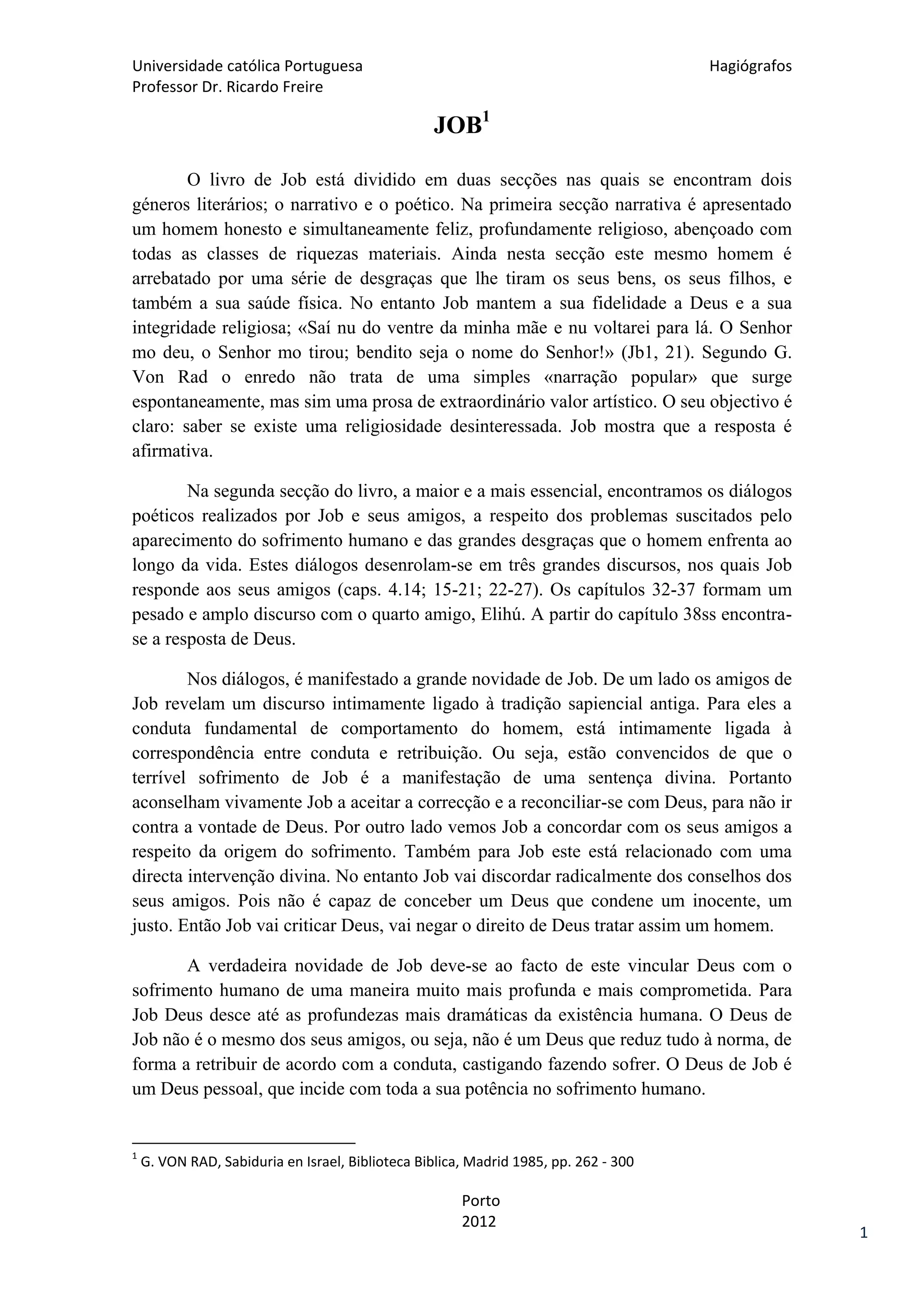 Este documento resume dois livros bíblicos: Job e Eclesiastes. No livro de Job, um homem justo sofre grandes desgraças, mantendo sua fé em Deus. Eclesiastes questiona os valores da sabedoria tradicional e vê a vida como vaidade, com Deus controlando os acontecimentos de forma misteriosa. Ambos desafiam a visão de que o sofrimento está ligado às ações, contribuindo para resoluções teológicas.