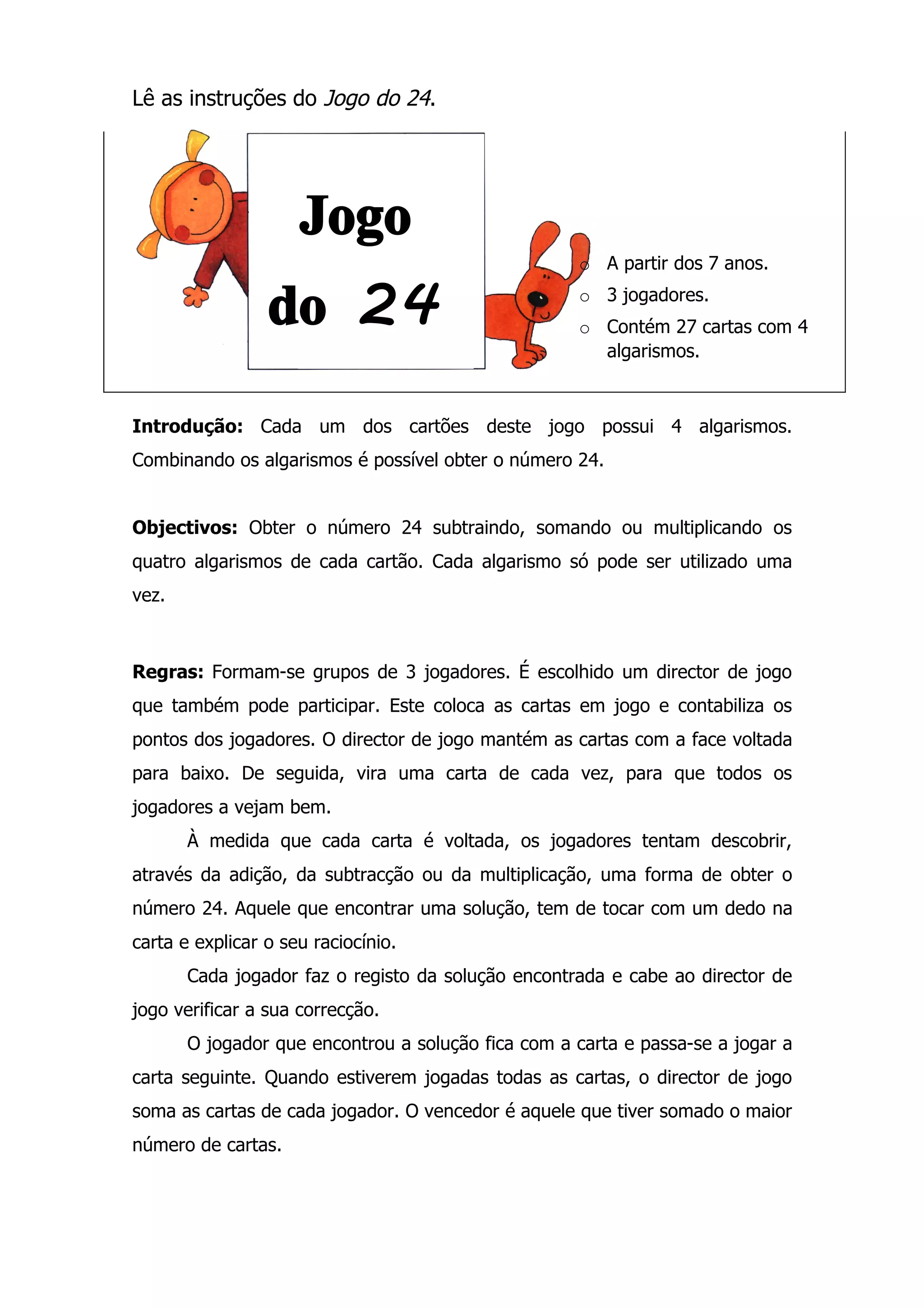 O Jogo do 24 é um jogo para 3 jogadores a partir dos 7 anos que utiliza cartas com 4 algarismos. O objetivo é obter o número 24 através da adição, subtração ou multiplicação dos algarismos em cada carta, usando cada algarismo apenas uma vez. O diretor de jogo vira as cartas uma de cada vez e os jogadores tentam obter soluções, anotando-as e ficando com a carta se corretos. Vence quem acumular mais cartas.
