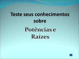 O documento descreve um jogo educativo direcionado a alunos a partir do 6º ano, com o objetivo de ensinar conceitos de potenciação e radiciação de forma divertida. Ele inclui perguntas interativas e instantâneas sobre as respostas corretas e erradas, permitindo a fixação do conteúdo. A estrutura do jogo envolve níveis de dificuldade e a opção de reiniciar o teste.