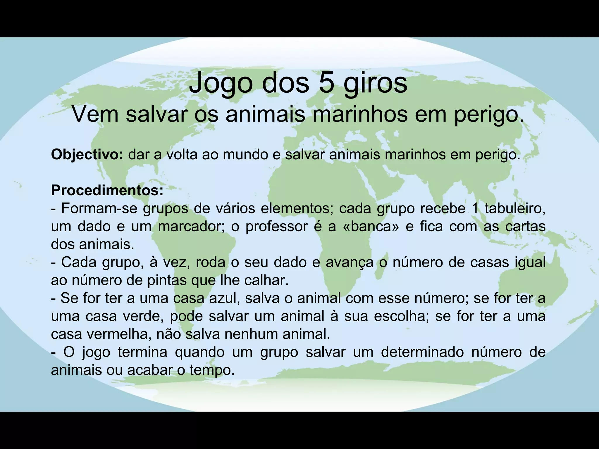 O documento descreve um jogo educativo sobre a conservação de animais marinhos em perigo. Os participantes giram um dado e avançam no tabuleiro para salvar animais cujas cartas descrevem suas características, habitat e ameaças. O objetivo é conscientizar sobre a importância de proteger estas espécies.