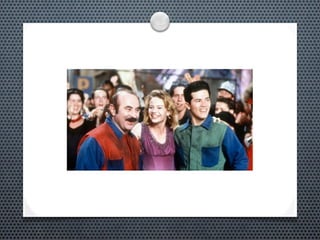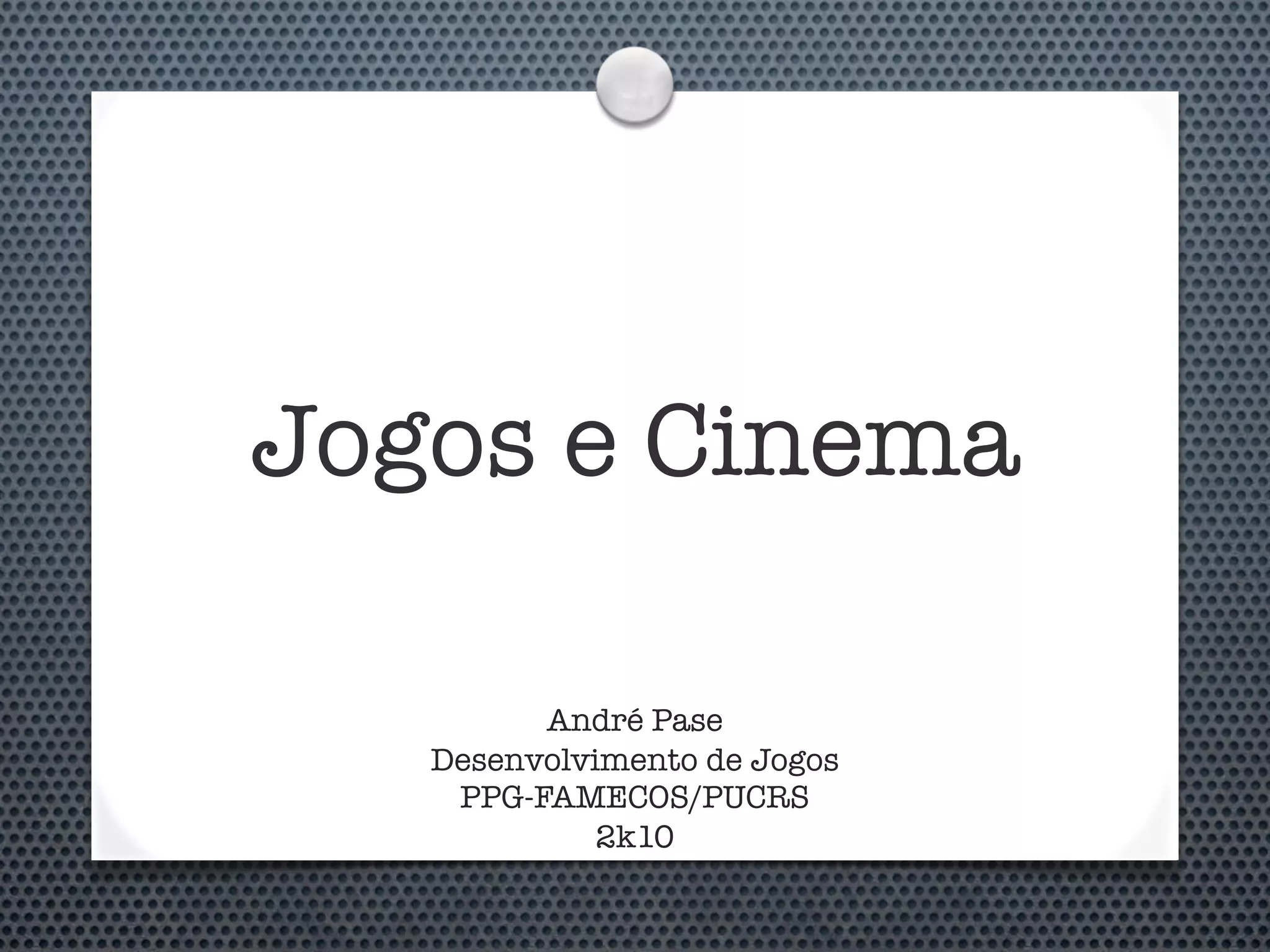 O documento discute as semelhanças e diferenças entre jogos e cinema. Ambos podem expandir narrativas, porém filmes são sequências de cenas enquanto jogos são sequências de fases. Nos jogos, o público toma ação na trama enquanto nos filmes há uma visão passiva. Alguns gêneros se adaptam melhor entre os meios do que outros.