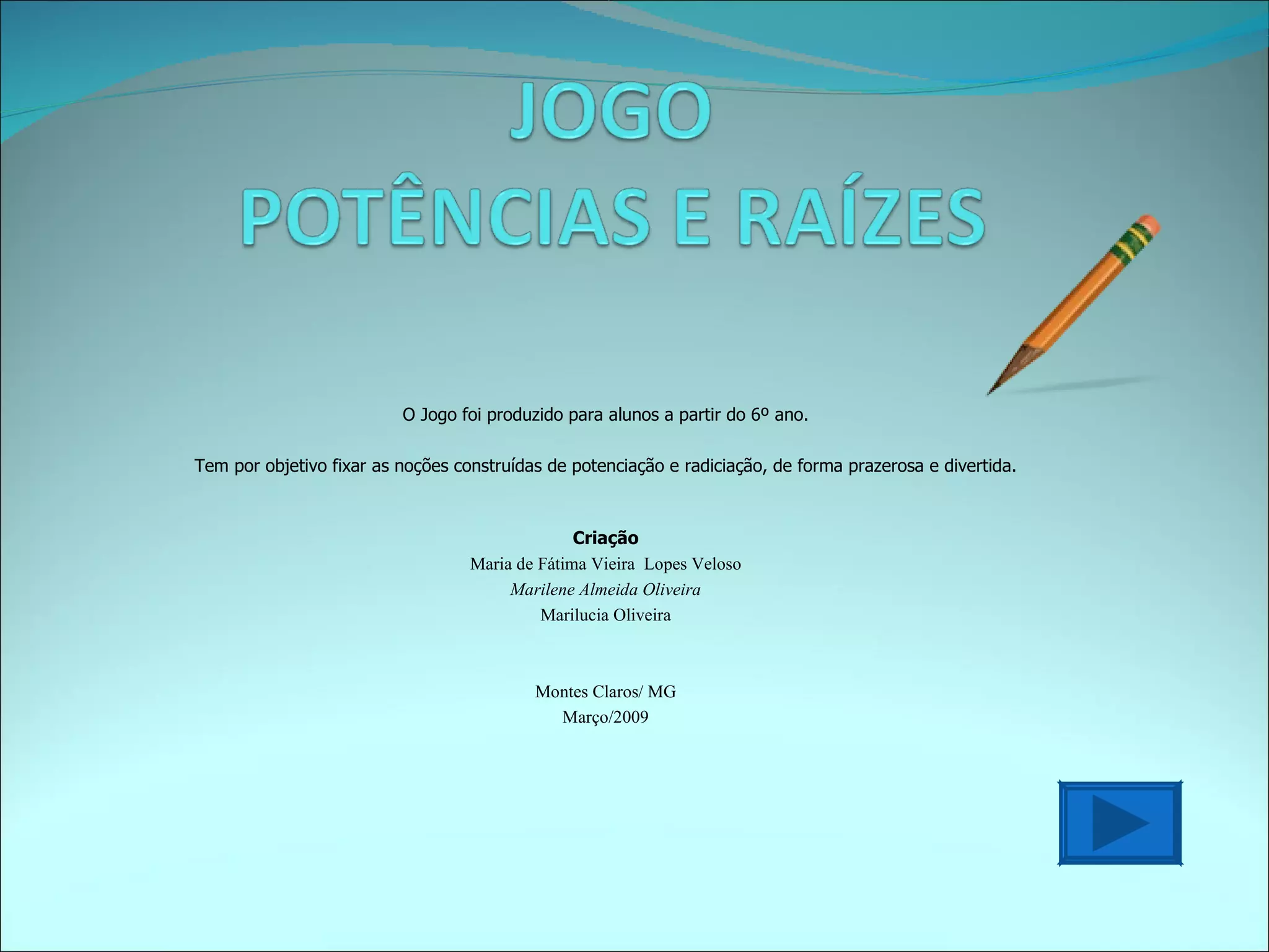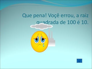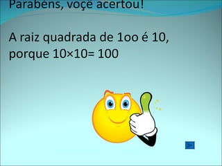 Este jogo educativo apresenta exercícios de potenciação e radiciação para alunos do 6o ano. Os participantes escolhem alternativas para questões como o quadrado da raiz quadrada de 4 e a raiz cúbica de 8, recebendo feedback sobre as respostas corretas.
