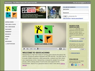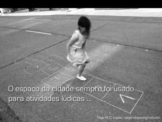 O documento discute jogos móveis locativos, que combinam tecnologias digitais móveis e sistemas de geolocalização para criar interfaces entre espaços físicos e eletrônicos para fins de jogo. Esses jogos expandem o espaço, tempo e socialidade dos jogos ao transcender suportes eletrônicos e físicos e misturar o tempo real com o virtual. Eles também incentivam novos tipos de apropriação e agenciamento dos espaços públicos urbanos.