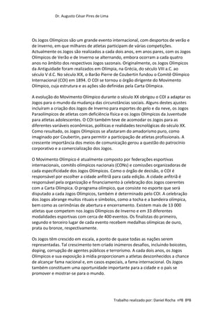 Os Jogos Olímpicos são um grande evento esportivo internacional realizado a cada dois anos que remonta à antiguidade grega e que atualmente é organizado pelo Comitê Olímpico Internacional para promover a paz através do esporte e reunir atletas de todo o mundo.