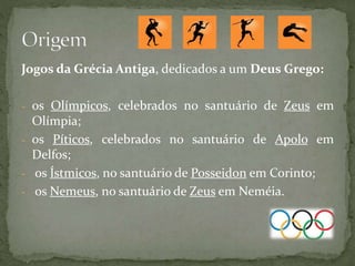 Os Jogos da Grécia Antiga eram realizados em santuários dedicados a deuses gregos e incluíam corridas, lutas e outras provas. Os Jogos Olímpicos modernos foram retomados em 1896 em Atenas e desde então ocorrem a cada quatro anos em diferentes cidades ao redor do mundo.