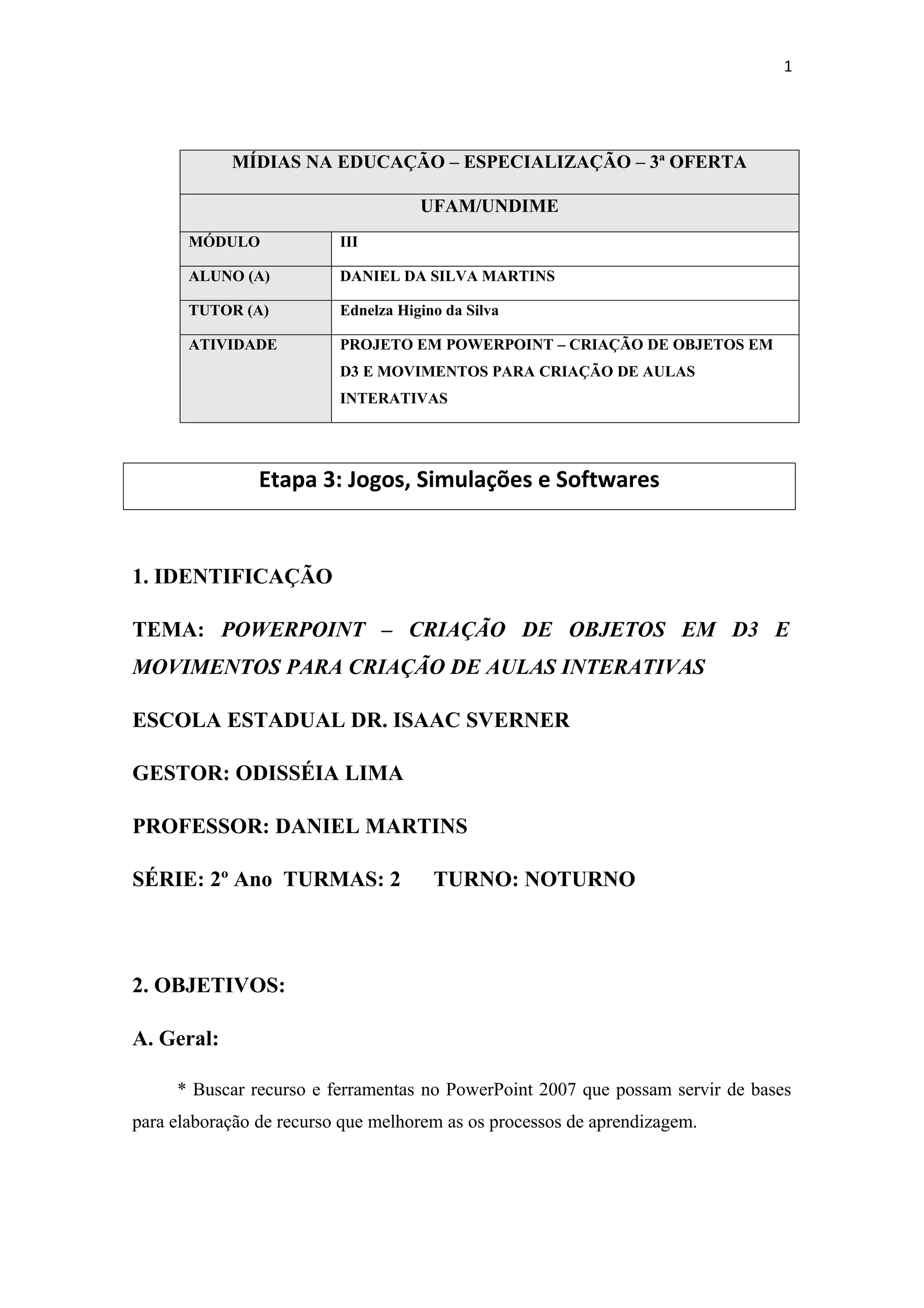 Este documento descreve um projeto para criar aulas interativas no PowerPoint usando objetos em 3D e movimentos. O projeto visa melhorar os processos de aprendizagem dos alunos do 2o ano do ensino fundamental usando ferramentas do PowerPoint. O documento detalha os objetivos, conteúdos, metodologia, recursos, cronograma e avaliação do projeto.