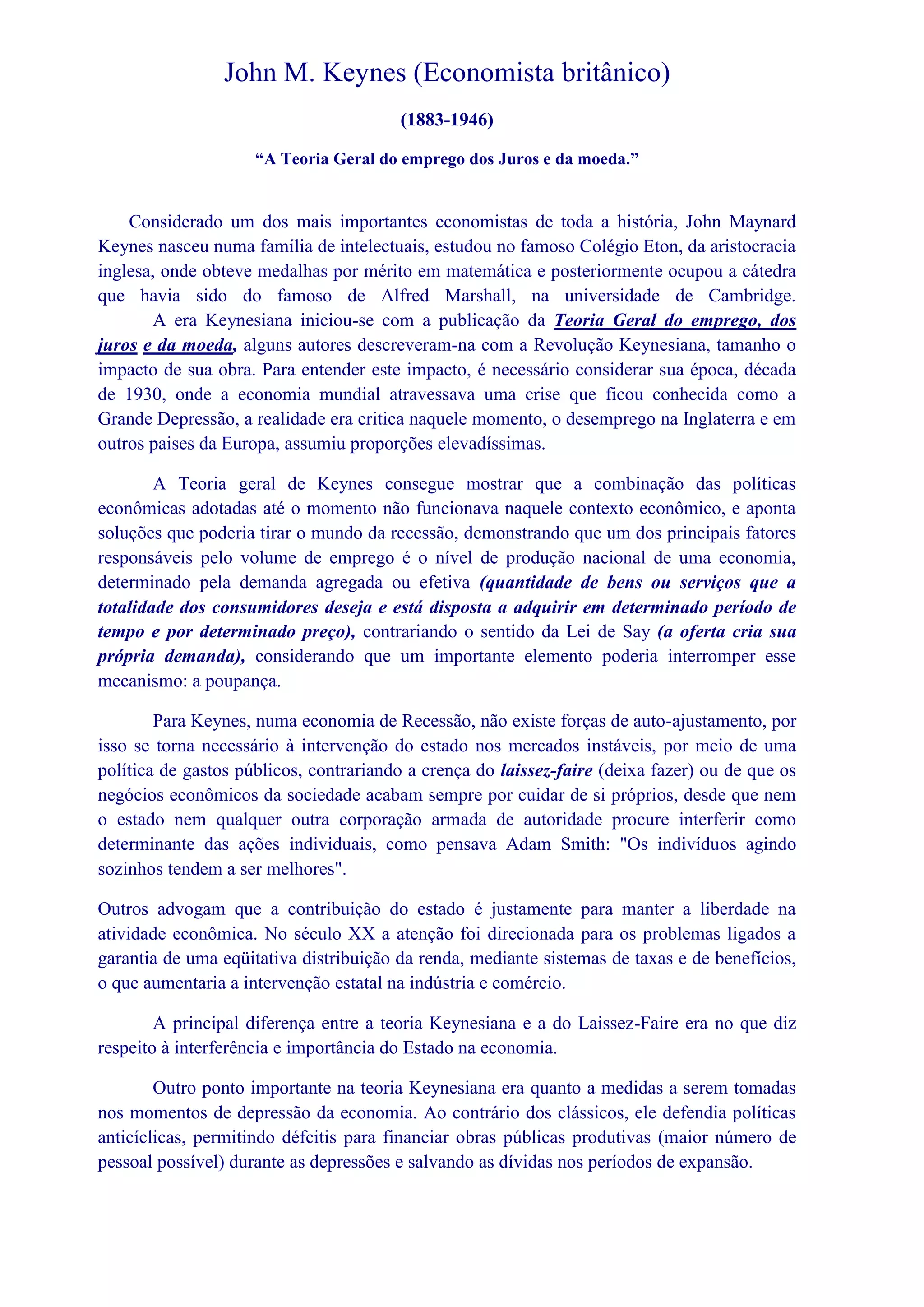 John Maynard Keynes foi um importante economista britânico do século XX, conhecido por sua obra "A Teoria Geral do Emprego, do Juro e da Moeda" que defendia a intervenção estatal na economia para combater a depressão, contrariando a teoria do laissez-faire. Sua teoria revolucionou o pensamento econômico ao propor políticas anticíclicas e gastos públicos para estimular a demanda e o emprego. Keynes é considerado o fundador da macroeconomia moderna.