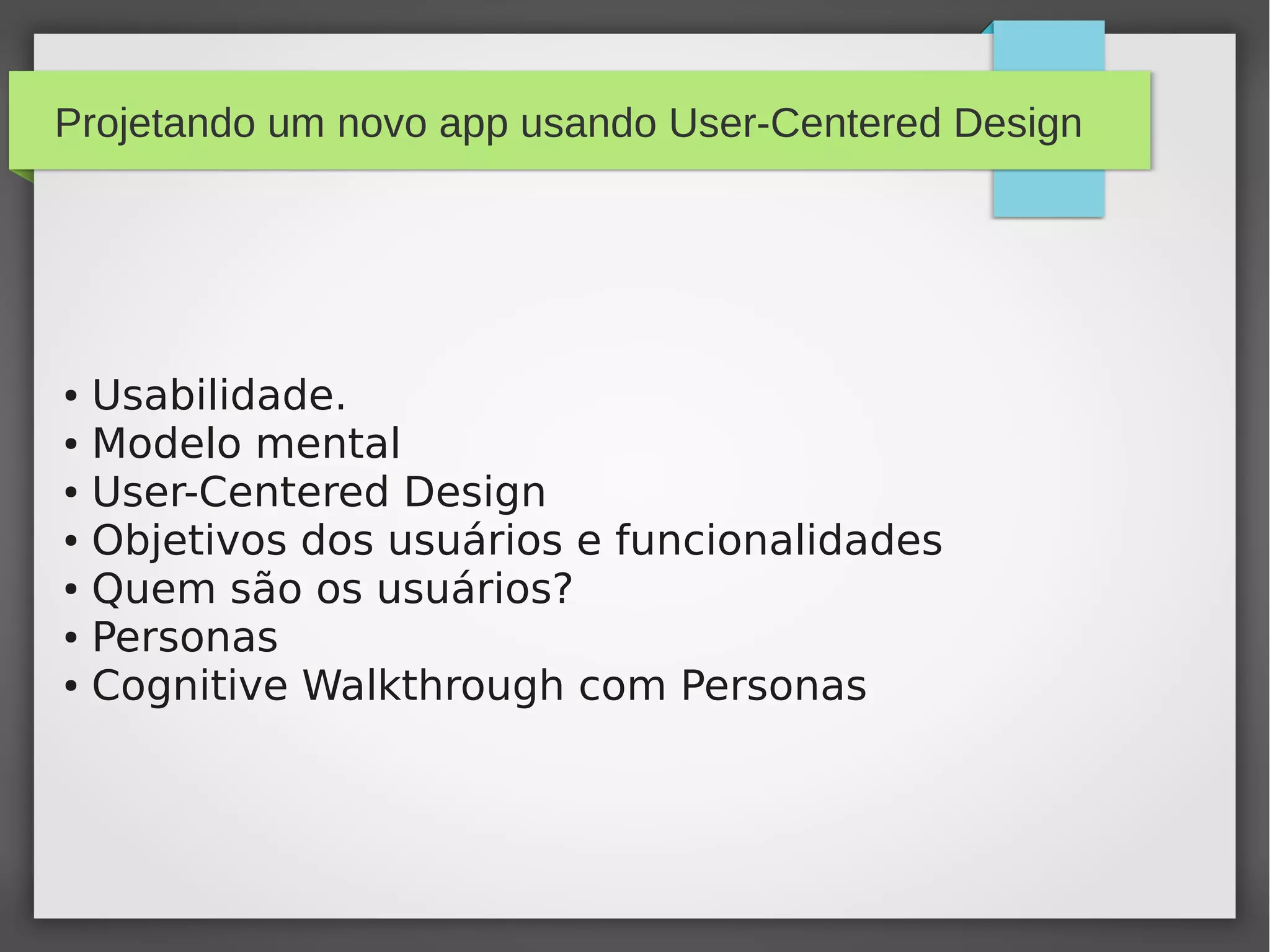 O documento discute o design centrado no usuário para a criação de aplicativos, destacando a importância da usabilidade e a compreensão dos objetivos dos usuários. Comenta sobre a necessidade de criar personas para representar os usuários e alinha funcionalidades do app a esses objetivos, evitando confusões com excessos de funcionalidades. O uso de métodos como o cognitive walkthrough com personas é sugerido para identificar problemas durante o desenvolvimento.