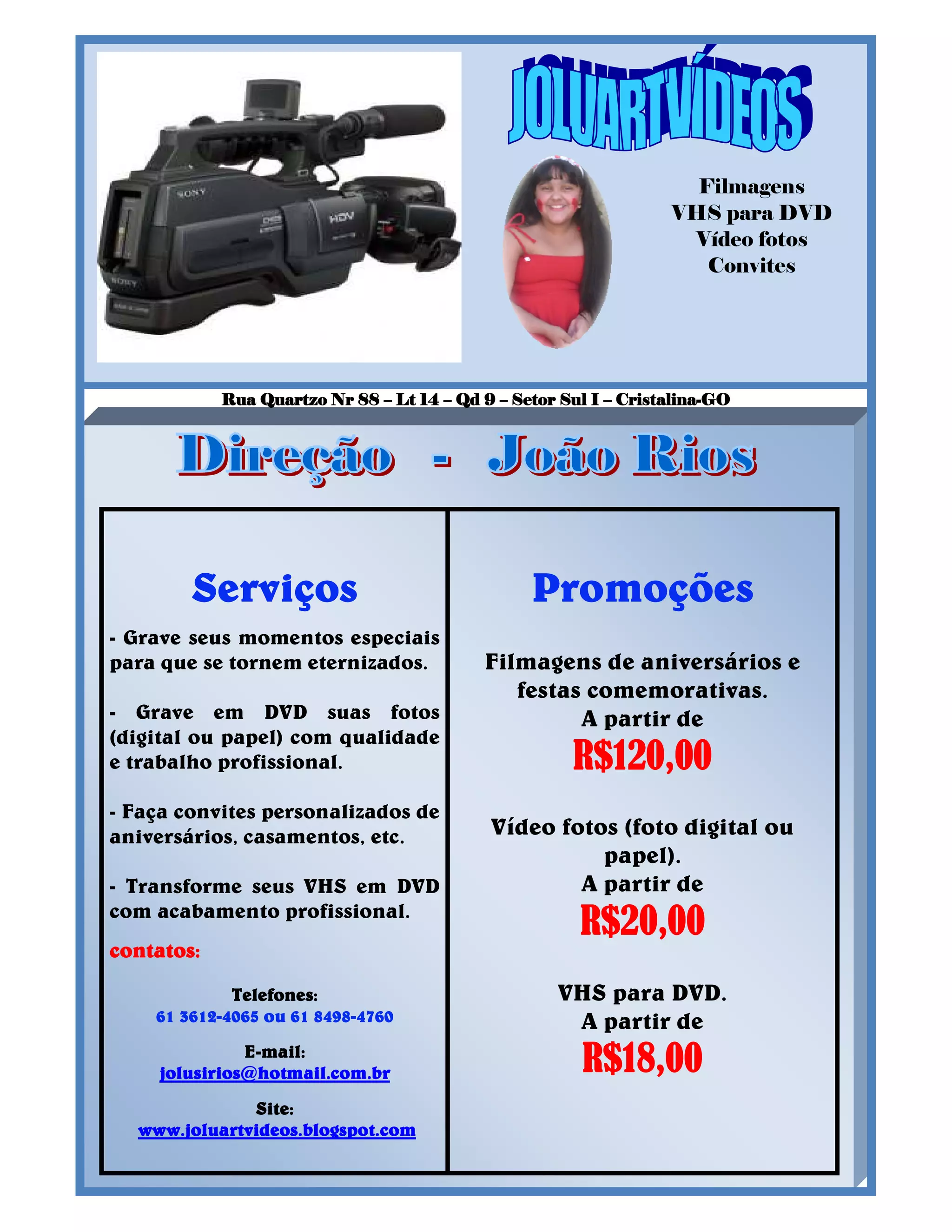 O documento oferece serviços de gravação em DVD de momentos especiais, fotos e convites personalizados, além de converter fitas VHS para DVD a partir de R$18,00. Os serviços incluem filmagem de aniversários e festas a partir de R$120,00 e gravação de fotos digitais ou em papel a partir de R$20,00.