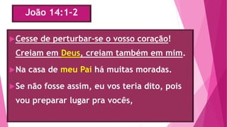 Este documento apresenta trechos do capítulo 14 do Evangelho de João. Nele, Jesus fala sobre a morada do Pai celestial, promete enviar o Espírito Santo como consolador, e enfatiza a importância de amar a Deus e obedecer seus mandamentos. O texto também contém orações de louvor e agradecimento a Deus Pai, ao Filho Jesus e ao Espírito Santo.