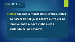 Este documento descreve Jesus defendendo uma mulher acusada de adultério e dizendo que quem estiver sem pecado que atire a primeira pedra. Ele também se declara como a luz do mundo e o Filho de Deus, o que os fariseus contestam, tentando apedrejá-lo.