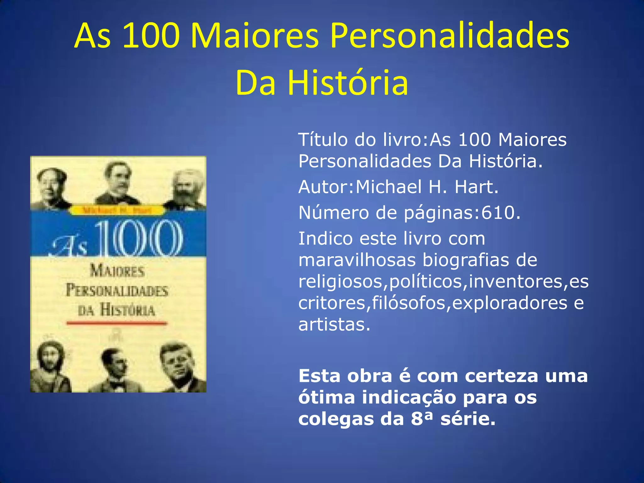 O livro "As 100 Maiores Personalidades Da História" lista as biografias mais influentes da história em 610 páginas. O autor recomenda o livro para estudantes do 8o ano como uma introdução inspiradora às vidas de figuras religiosas, políticas, científicas e artísticas que moldaram o mundo.