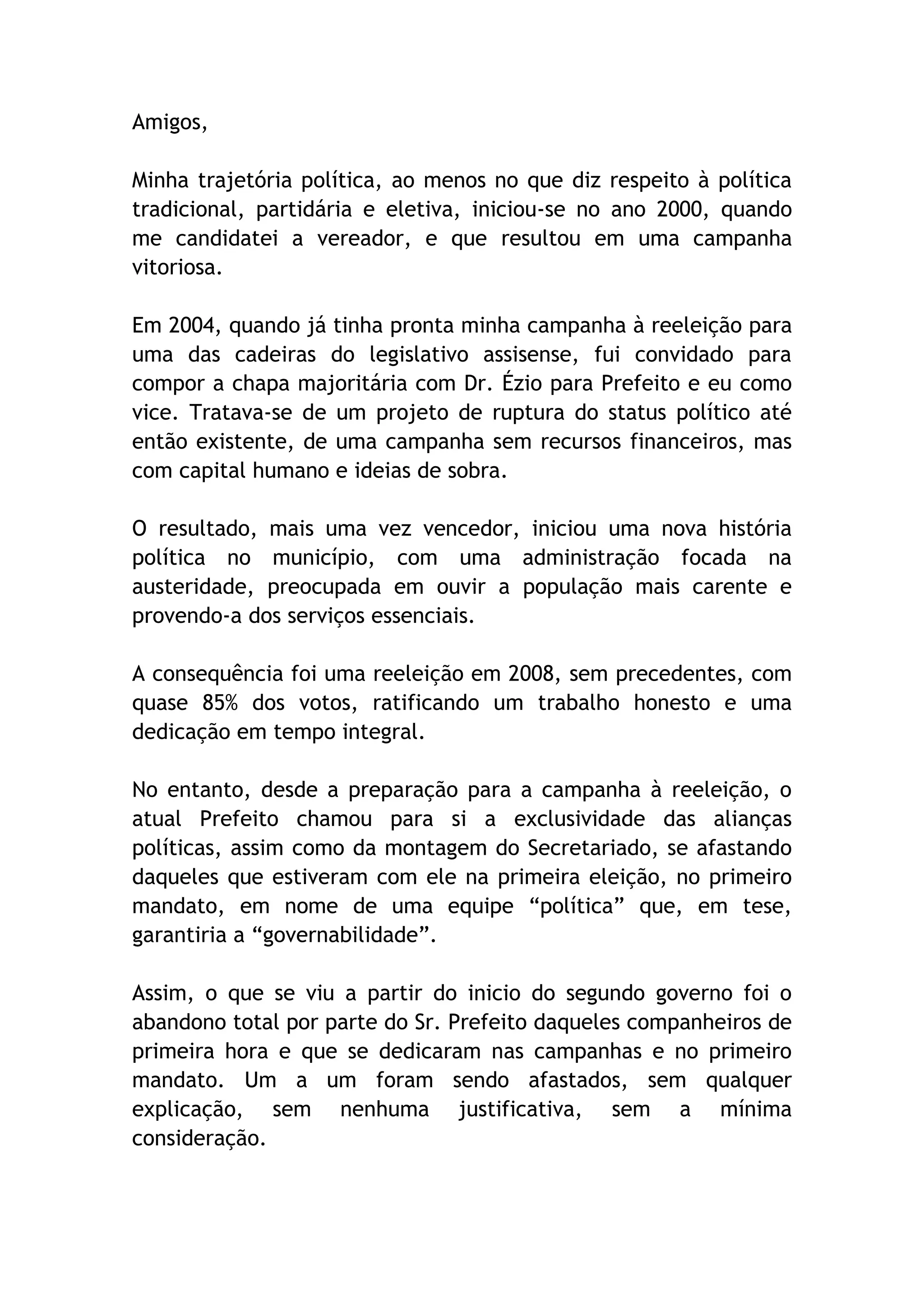 O documento resume a trajetória política do autor desde 2000 quando foi eleito vereador. Em 2004, foi convidado a ser vice-prefeito na chapa do Dr. Ézio, e foram eleitos. No entanto, desde a reeleição em 2008, o prefeito vem se afastando dos antigos aliados e surgem denúncias de irregularidades. Isso levou o autor a solicitar seu retorno à Secretaria de Segurança Pública, onde era delegado, mas mantém expectativa do cargo de vice-prefeito e continuará sua ação política.